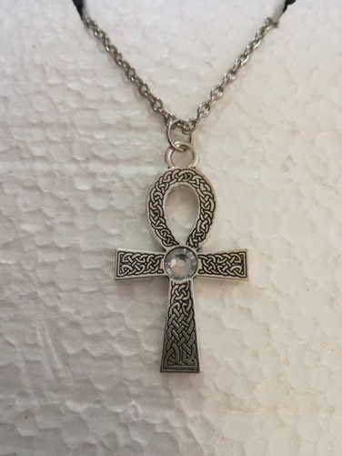 Crucea Ankh este un străvechi simbol egiptean, reprezentând soarele, renașterea universală permanentă. Partea de sus ca o lacrimă reperzintă soarele, conectat direct la o cruce , care semnifică răsăritul soarelui dincolo de orizont. Ankhul mai poate simboliza viața pe pământ, viața eternă, lumea de sub pămant, renașterea, un simbol care apare in scrierile egiptene, cât și purtată de devierse zeități, cum ar fi zeul Anubis. Colierul are un medalionul decorat cu un cristal alb, ceea ce îi conferă un plus de frumusețe !