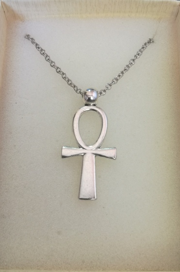 Crucea Ankh este un străvechi simbol egiptean, reprezentând soarele, renașterea universală permanentă. Partea de sus ca o lacrimă reperzintă soarele, conectat direct la o cruce , care semnifică răsăritul soarelui dincolo de orizont. Ankhul mai poate simboliza viața pe pământ, viața eternă, lumea de sub pămant, renașterea, un simbol care apare in scrierile egiptene, cât și purtată de devierse zeități, cum ar fi zeul Anubis. Colierul are un medalionul argintiu cu față dublă, plină, 5.5 cm.