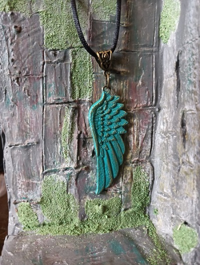 Un frumos pendant cu tentă antique, reprezentând o aripă de înger. Cu snur negru, cca 5cm. Expediere prin poșta română sistem ramburs.