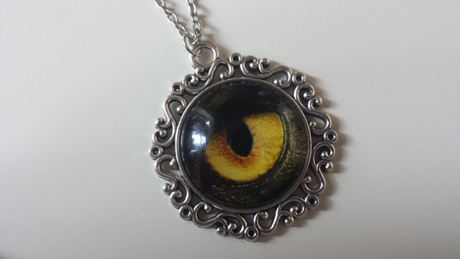 Medalion gothic cu ochi de lup, 2.5 cm diam / 4 cm, șnur negru.